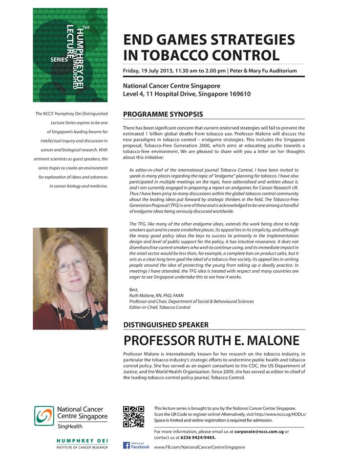 TFG & National Cancer Center Singapore hosted Prof Ruth Malone at the Humphrey Oei Disttinguished Lecture Series. Prof Malone’s talk entitled ‘End Game Strategies in Tobacco Control’ was presented to healthcare workers and public who attended the lecture. This talk resonated well with TFG’s agenda of building a new generation of non-smokers via education and social movement.