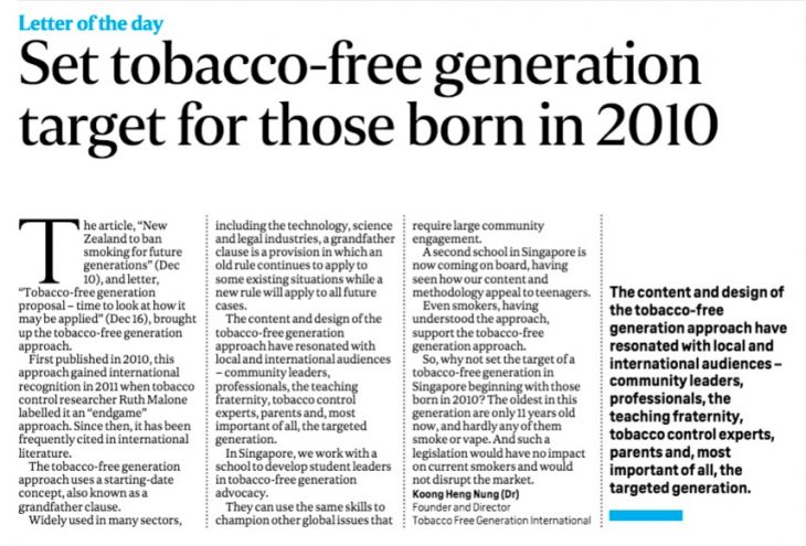 Even smokers, having understood the approach, support the tobacco-free generation approach. So, why not set the target of a tobacco-free generation in Singapore beginning with those born in 2010? The oldest in this generation are only 11 years old now, and hardly any of them smoke or vape. And such a legislation would have no impact on current smokers and would not disrupt the market.